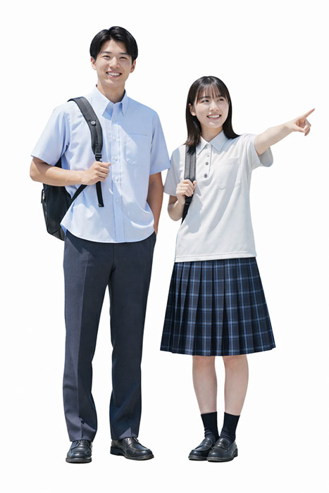 シャツは男女とも半袖カッターシャツ(水色)/ポロシャツ(白色)が自由に選べます。