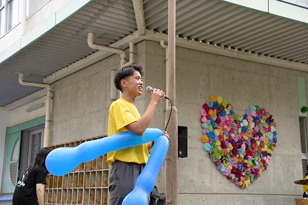 生徒会長あいさつ バックには文化記録委員制作のハート型の花