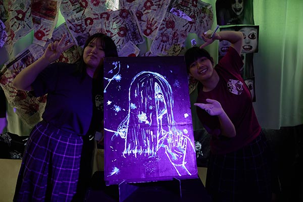 2-1恐怖の空き教室&宝さがし 暗闇でフラッシュで写真を撮ると蛍光塗料で描かれた絵が浮かび上がる