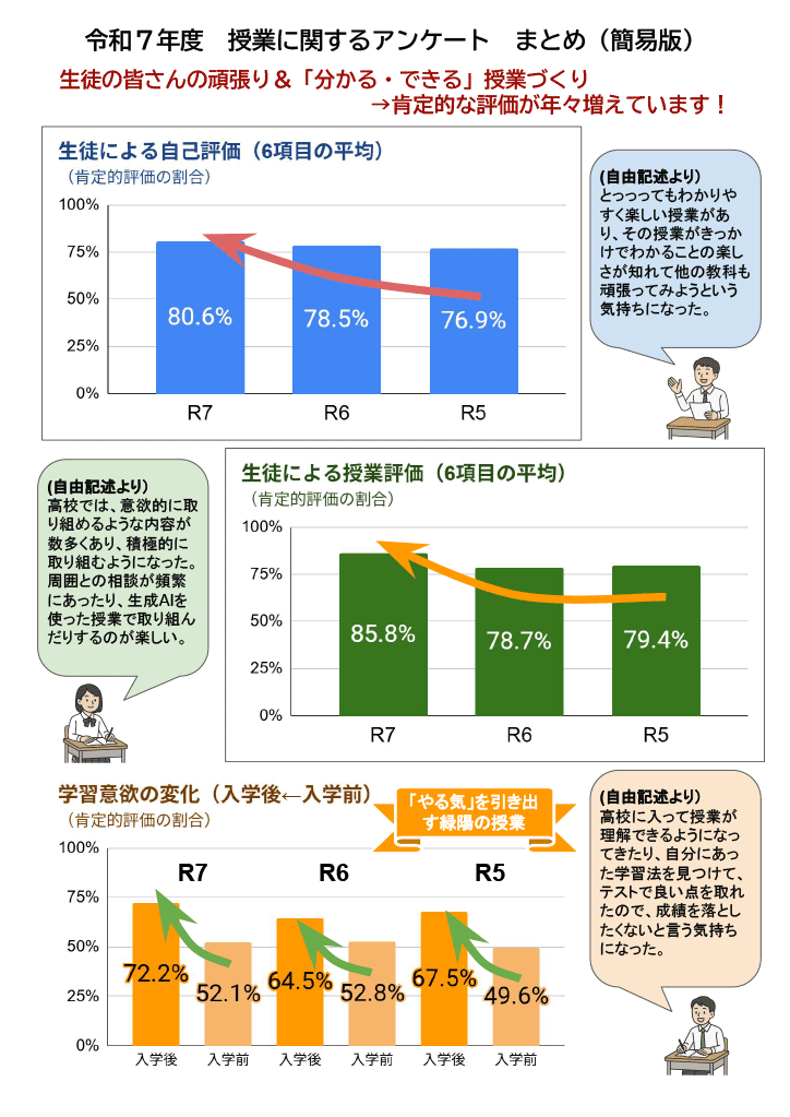 結果は、昨年度からさらに数値が改善し、特に「授業についての肯定的評価」については7.1%もの大幅アップとなりました!