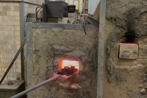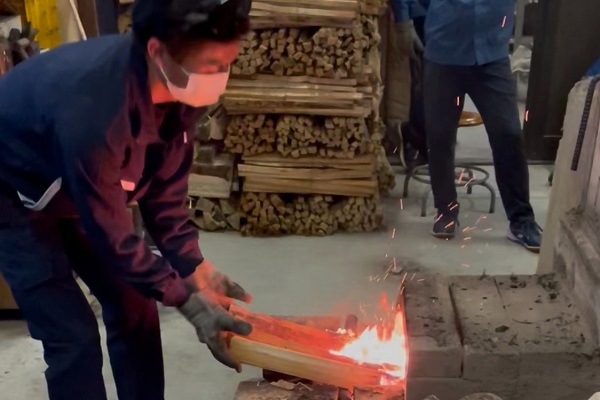 22:10 窯内の作品の上に炭をかけていきます。