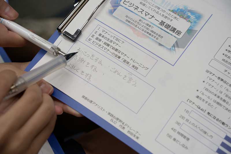 研修では手の挙げ方から姿勢、言葉遣いなど、社会人として必要とされるビジネスマナーについて、実技を交えながら楽しく教えてくださいました。
