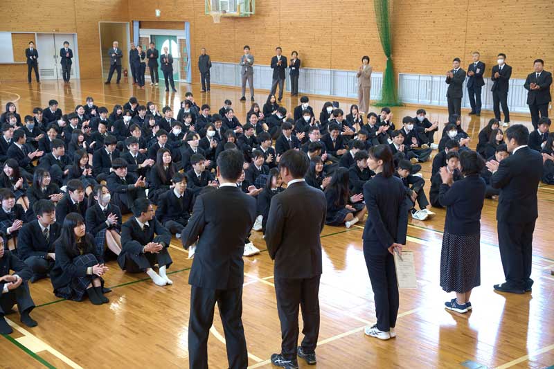 新任式では8名の先生方が出席され、新任者を代表して理科の内海先生があいさつをされました。